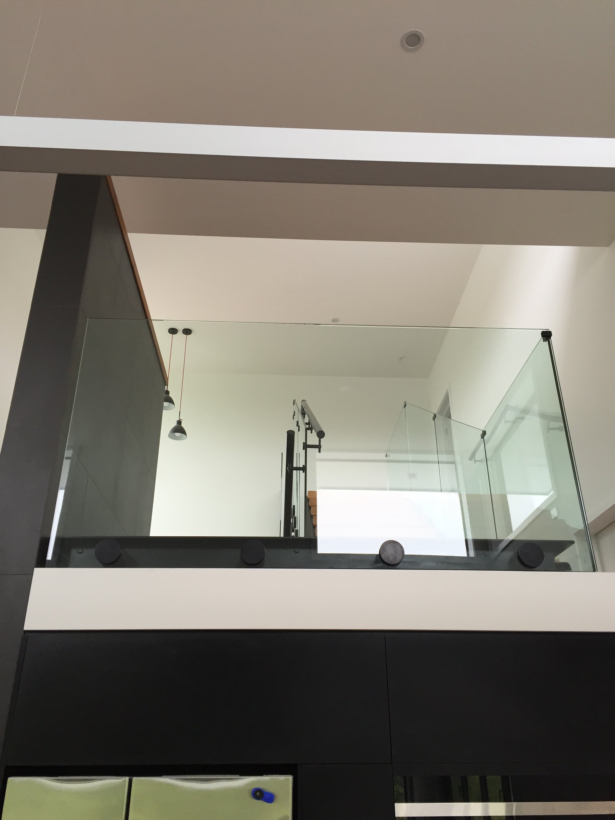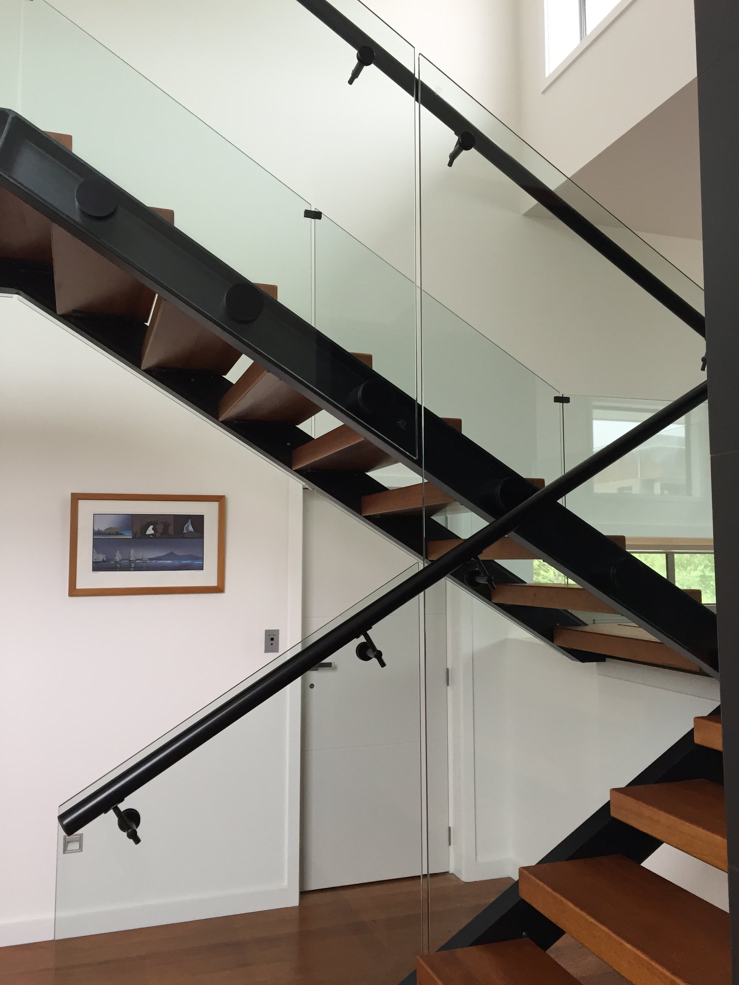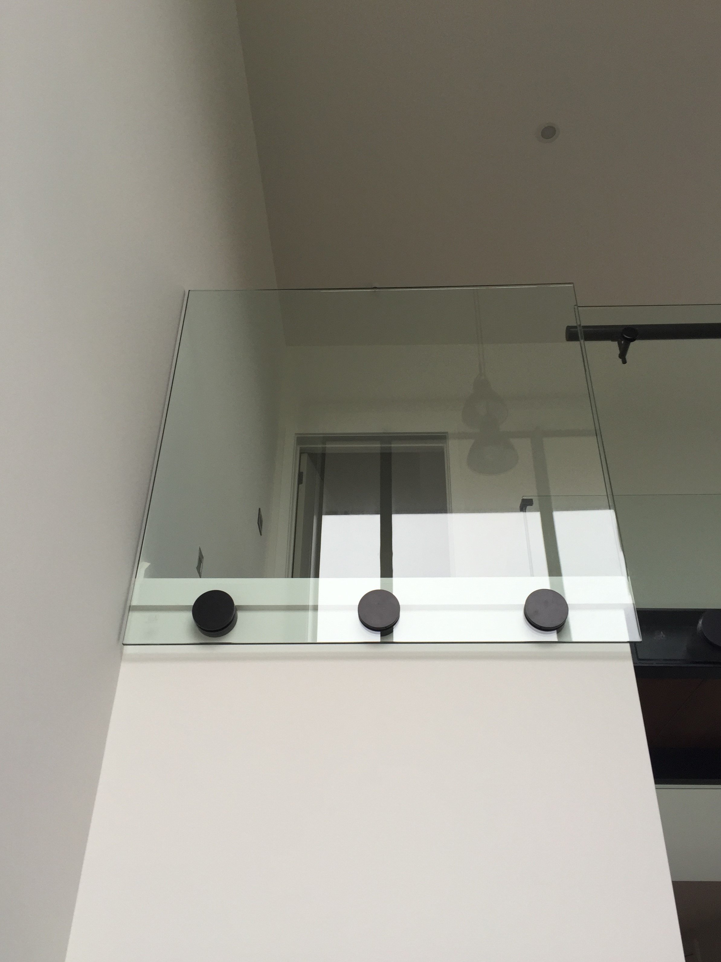 We thought we would start with a unique Balustrade - Our Single Disc System, using 12mm Clear Toughened Glass and Handrail on Brackets - All Powdercoated Black.